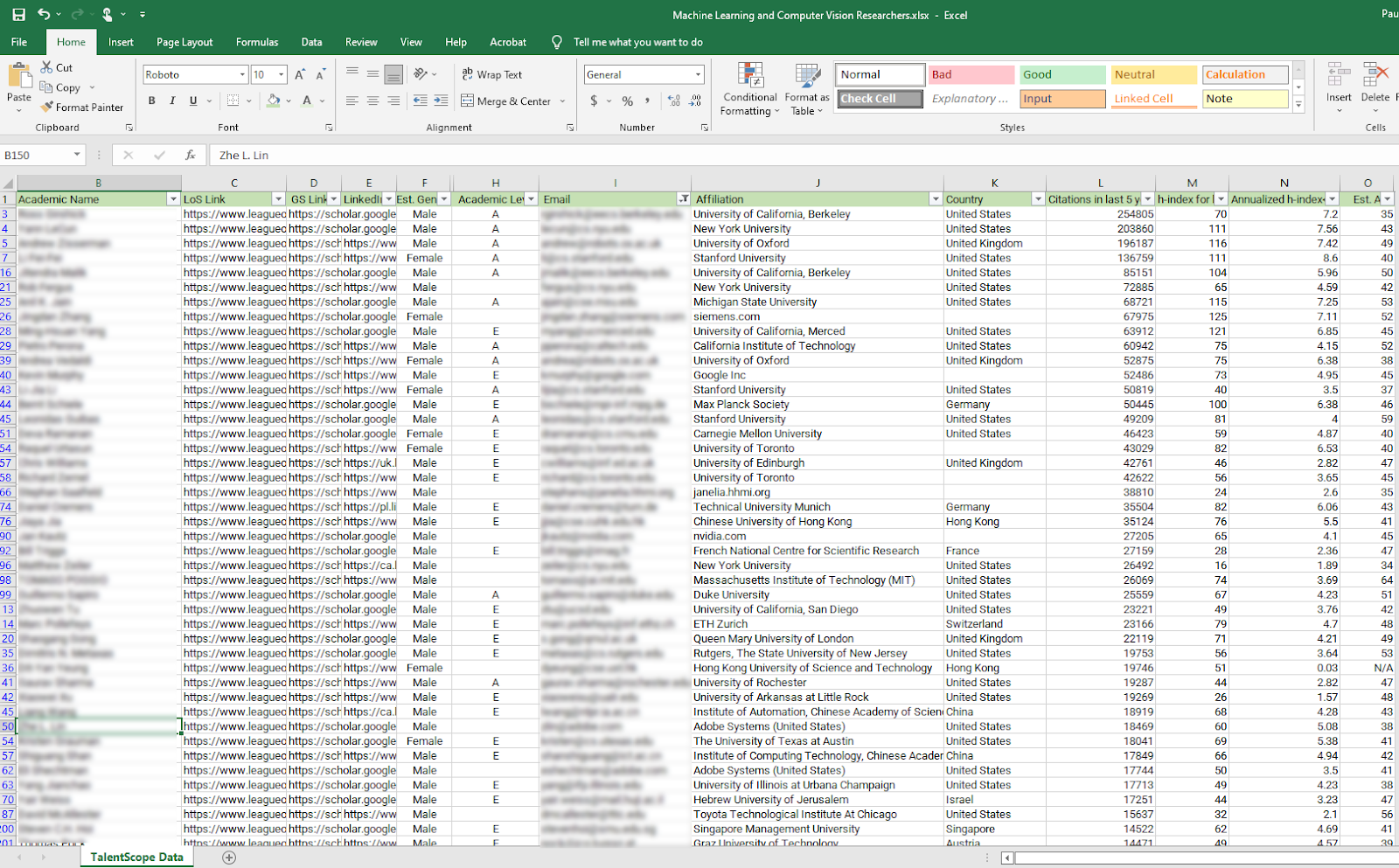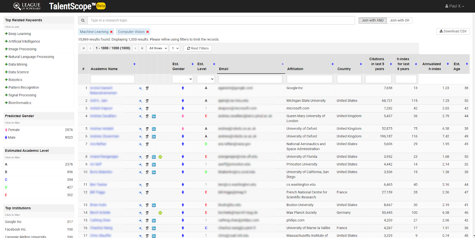 Researchers can be filtered by research interests, country, institutional affiliations as well as a number of customised inferred features including gender, current academic level eg lecturer or professor etc and estimated age. Lists can be quickly downloaded for further review and shortlisting with bibliometric data, other linkages and contact details.